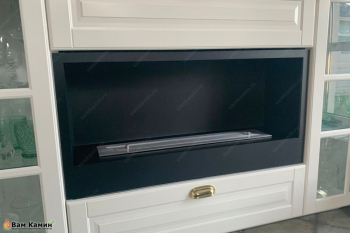 Еще один пример того, как можно элегантно встроить биокамин в мебель. В данном случае по фото видно, что биокамин SteelHeat поместили в тумбу шкафа для посуды. При этом экокамин изготавливался на заказ по желаемым размерам покупателя и с индивидуальным дизайном рамки очага. В итоге черный биокамин в интерьере выглядит акцентировано на фоне белого тона окраски шкафа для посуды.
