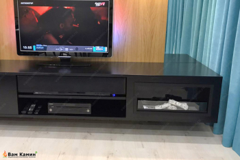 Встраиваемые биокамины можно монтировать не только в обычную нишу, но и в мебель. Это с успехом доказал биокамин в нишу SteelHeat LEADER 700 Small . Черная модель биокамина великолепно вписалась в темную ТВ тумбу. Декоративные дрова в виде светлых березовых поленьев добавили контраста на черном фоне и придали общей дизайнерской задумке завершенности.